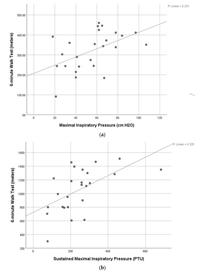 (a). Scatterplot of the relationship between maximal inspiratory pressure and the 6-min walk test. (b). Scatterplot of the relationship between sustained maximal inspiratory pressure and the 6-min walk test.
