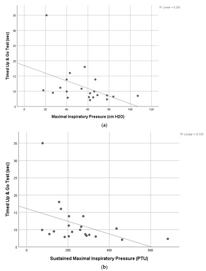 (a). Scatterplot of the relationship between maximal inspiratory pressure and the timed up and go test. (b). Scatterplot of the relationship between sustained maximal inspiratory pressure and the timed up and go test.