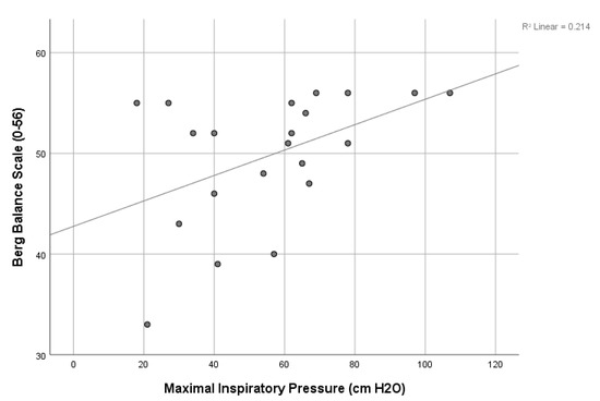 Scatterplot of the relationship between maximal inspiratory pressure and the Berg balance scale.