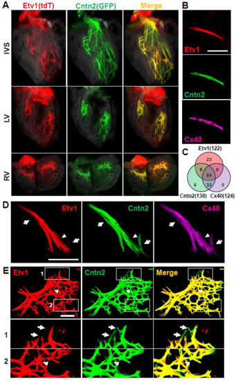 Heterogeneity of conduction system markers. (A) In situ views of the adult ventricular conduction system labeled by Etv1CreERT2/R26-tdT and Cntn2-GFP in the same mice. Unfixed hearts were dissected to expose the interventricular septum (IVS), left ventricle (LV), and right ventricle (RV) luminal surfaces. (B) An example of an isolated single cell that is triple labeled by tdT (Etv1), GFP (Cntn2), and Cx40. (C) Summary of overlap in expression of these three markers in 161 cells expressing at least one of these. Note that although there were no Cx40+ only or Cx40+Etv1+ double positive cells in this analysis, in other cell preps we observed such cells (see panel 1D). (D) A small cluster of conduction cells, most of which are triple positive; arrows point to two cells that are Cntn2+Cx40+ only, and the arrowhead points to one cell that is Etv1+Cx40+ only. (E) A clump of partially digested tissue containing an array of conduction fibers and cells. This preparation was stained only for GFP and tdT. The boxed regions are shown at higher magnification in the panels below. Arrows and arrowheads point to cells that are Cntn2+ only and Etv1+ only, respectively. Scale bars are 100 µm in B and D, 250 µm in E.