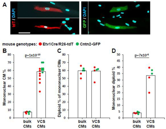In single-cell ventricular suspensions from mice separately expressing either Cntn2-GFP or Etv1CreERT2/R26-tdT individually, it was immediately obvious that the conduction cells were disproportionately mononuclear (Figure 2A). Mononuclear CMs comprised 7% of the overall ventricular CM population of these mixed-strain mice, a level typical for ventricular populations across many inbred mouse strains [12]. In contrast, over half of the Etv1 lineage (tdT+) or Cntn2-GFP+ CMs (57% for both combined) were mononuclear (Figure 2B). Because mononuclear CMs may have 2n or 4n (or higher) nuclei, we also measured the nuclear ploidy of the mononuclear CM population. Overall, 58% of the conduction mononuclear CM nuclei and 59% of the nonconduction (bulk) mononuclear CMs from the same hearts were 2n (the remainder being mostly 4n, with very few nuclei at higher ploidy level) (Figure 2C), which is typical for mice, as seen in our prior studies [12,35]. Thus, approximately one-third (57% × 58% = 33%) of the ventricular conduction CMs are 1 × 2n (diploid), compared to only 4% of bulk CMs (Figure 2D).