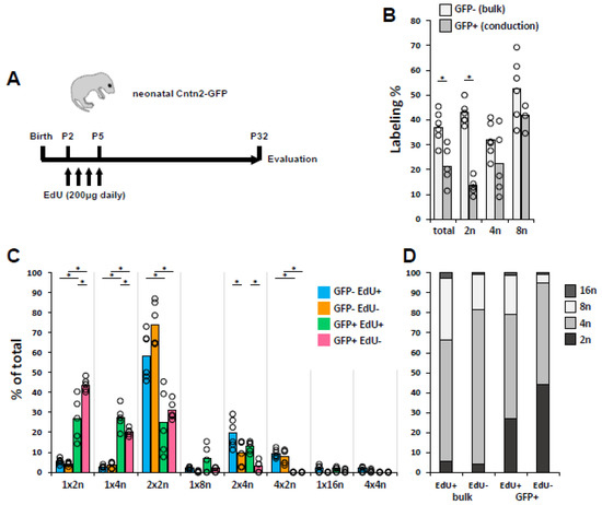 Cell cycle dynamics of bulk (nonconduction) and ventricular conduction (VCS) CMs based on neonatal EdU incorporation. (A) Schematic of the treatment protocol. (B) Percentage of nonconduction (GFP−) and conduction (GFP+) CMs that were labeled by EdU when analyzed at P32. Data for each are shown for all CMs (total) and then broken down by individual ploidy class. Each dot represents cells from one mouse. (C) Distribution of EdU+ and EdU− cells for GFP− (bulk) and GFP+ (conduction) CMs segregated by ploidy type. Each dot represents cells of the indicated type from one mouse. (D) Aggregation of the data in panel C by ploidy level. The 2n bars here are identical to the 1 × 2n bars in panel C, the 4n bars here are the sum of the 1 × 4n and 2 × 2n bars in panel C, etc. Statistical values for all comparisons in panels B and C are provided in Supplementary Materials; * indicates statistically significant differences.