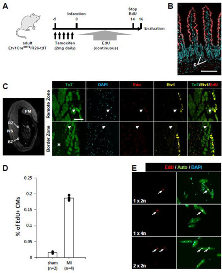 Infarction and analysis. Tamoxifen was administered to Etv1CreERT2/R26-tdT mice by i.p. injection once per day for 5 days, and the day after the last dose, mice were subjected to left anterior descending artery (LAD) ligation. After LAD ligation, an Alzet pump (model 1002, release rate 0.25 µL/hr, 14-day minimum capacity; Durect Corp., Cupertino, CA, USA) containing 50 mg/mL EdU (A10044, Thermo Fisher Scientific, Waltham, MA, USA; dissolved in DMSO then diluted 1:1 with saline) was implanted subcutaneously under the back skin. Then, 14 days later, the Alzet pumps were removed under light anesthesia, and 2 days later the mice were euthanized and hearts removed for analysis. Noninjured (sham) mice were siblings of the infarcted mice and were treated identically except without LAD ligation.