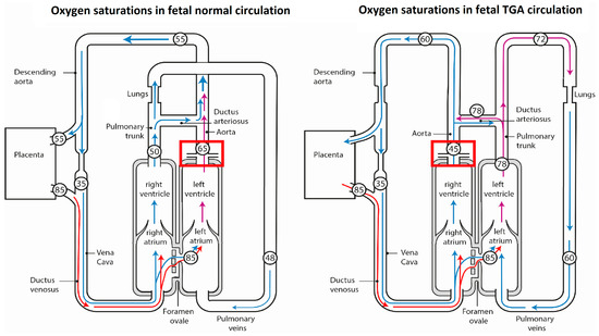 Transposition of the great arteries (TGA) is a complex congenital heart malformation and affects approximately 3 in 10,000 live births [1]. The morphological key feature of TGA is ventriculoarterial discordance, with the aorta arising from the morphological right ventricle (RV) and the pulmonary artery from the morphological left ventricle (LV). TGA is compatible with fetal survival and normal body growth; however, the ventriculoarterial discordance and accompanying lesions are associated with altered hemodynamics and oxygen saturation in the fetal circulation [2]. Although venous flow patterns are similar to normal in fetal TGA patients, higher oxygen saturations (>75%) in TGA are presumed to be present in the pulmonary artery and ductus arteriosus as compared to the normal fetal heart (50%) and lower oxygen saturations in the ascending aorta and coronary arteries (45% versus 65%) [2] (Figure 1). As a consequence, to provide the same oxygen delivery as in the normal fetus, coronary perfusion would have to be substantially higher. We hypothesize that this lower coronary oxygen saturation in utero might induce fibrotic remodeling of the myocardium in the TGA circulation that may persist after birth.