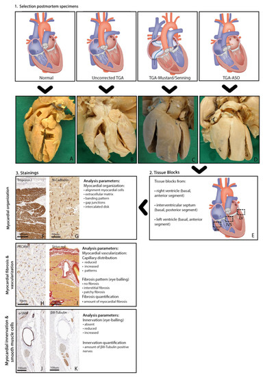 Illustration study design. Study design: illustration of all consecutive steps. 1. Selection postmortem specimens: postmortem specimens were obtained from the Leiden Collection of Congenital Malformations, including the following groups: normal specimens (A), uncorrected TGA specimens (B), TGA-Mustard/Senning specimens (C) and TGA-ASO specimens (D). 2. Tissue blocks: transmural tissue blocks were obtained from three different sites in each specimen (E); right ventricle, interventricular septum, and left ventricle. 3. Stainings: the following (DAB) stainings were performed: cardiac troponin-I (F) (myocardial organization), N-Cadherin (G) (myocardial organization), PECAM1 (H) (myocardial vascularization), Picrosirius Red (I) (myocardial fibrosis), α-SMA (J) (smooth muscle cells) and βIII-tubulin (K) (myocardial innervation). Abbreviations: ASO, arterial switch operation; DAB, 3-30diaminobenzidine tetrahydrochloride; IVS, interventricular septum; LV, left ventricle; PECAM1, platelet endothelial cell adhesion molecule-1; RV, right ventricle; α-SMA, alpha smooth muscle actin; TGA, transposition of the great arteries.