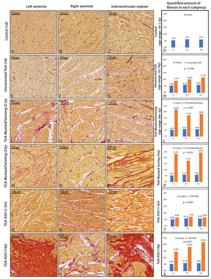 Quantification of fibrosis in control, uncorrected TGA, TGA-Mustard/Senning, and TGA-ASO.