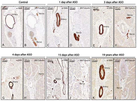 Myocardial innervation in uncorrected TGA and TGA-ASO. Myocardial innervation in uncorrected TGA and after ASO. Innervation post-ASO was evaluated in carefully matched sections in areas with cross-sectioned coronary vessels and compared between controls and TGA-ASO specimens. Visualization of cross-sectioned arteries and veins was performed by α-SMA staining (A,C,E,G,I,K). Innervation staining: (B) βIII-tubulin-positive nerves around coronary arteries and veins in uncorrected TGA. (D); postmortem hearts that survived 1 day after ASO showed βIII-tubulin-positive nerves, the uptake was comparable to the control specimen. (F,H,J,L); reduced uptake of βIII-tubulin around cross-sectioned coronary vessels after 3 days, 4 days, 15 days, and 19 years after ASO. Abbreviations: ASO, arterial switch operation; TGA, transposition of the great arteries; α-SMA, α smooth muscle actin.