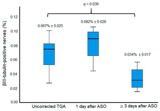 Comparison of βIII-tubulin-positive nerves in TGA-ASO and uncorrected TGA. Boxplot: the mean amount of βIII-tubulin-positive nerves between the control group (uncorrected TGA) (n = 8), TGA 1 day after ASO (n = 4), and TGA ≥ 3 days after ASO (n = 4). Abbreviations: ASO, arterial switch operation; TGA, transposition of the great arteries.