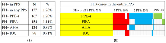 Regarding the PPS systems and their FH detection functionality, the PPE-4 protocol was the one with the highest number of FH+ cases detected (167 athletes; 1.20%), followed by FIFA (154; 1.11%), AHA (124; 0.89%), and IOC (98; 0.71%) protocols. The exact distribution of positive results among the PPS systems for all 177 FA+ athletes is graphically shown in Figure 1. Pairwise comparisons revealed statistically significant differences in the results between the PPS systems (significance adjusted for multiple testing; resulting in all PPS pairs at p < 0.001; the IOC-AHA pair at p = 0.002), except for the PPE-4 and FIFA pair (p = 0.42); (Supplementary Table S1).