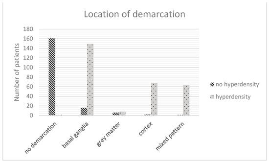Based on this pathophysiology, the extension of the lesion—represented by the total volume as well as the ASPECTS—is an obvious predisposing factor for the development of a leakage in the BBB and the development of hyperdensities as a larger damaged volume has a higher probability for a breakdown of the BBB. Furthermore, our data imply that the development of hyperdense lesions is more likely in the grey matter (basal ganglia and cortex) than in white matter. This represents the fact that grey matter has a higher level of vascular dependency regarding anatomical vascular density as well as physiological demand and is therefore more vulnerable to ischemic episodes and early damage of the BBB [30,31,32,33].