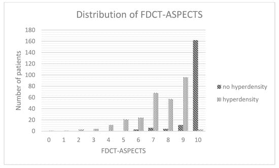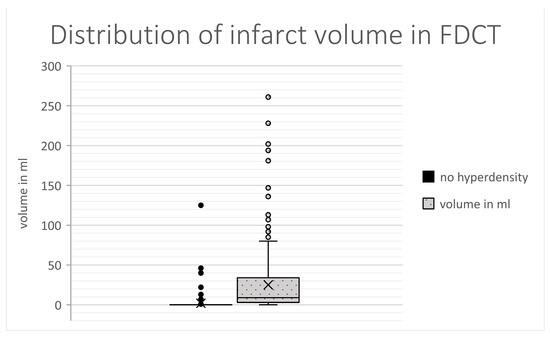 The results of the FDCT after EVT differed in the type of brain region affected (dominance in areas of grey matter in the hyperdense group, p < 0.001, Spearman-rho: 0.791), the volume of demarcation (25.1 mL [2.8–33.7] vs. 0 mL [0–0], p < 0.001, Spearman: 0.751) and the FDCT-ASPECTS (8 [7–9] vs. 10 [10–10], p < 0.001, Spearman-rho: −0.769).