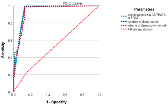 To further determine the predictive power of these items, a ROC curve analysis was performed (Figure 7). The AUC for the INR was 0.461 (p = 0.153, 95%-CI: 0.409–0.514), for the location of demarcation it was 0.053 (p < 0.001, 95%-CI: 0.03–0.076), for the volume of demarcation it was 0.067 (p < 0.001, 95%-CI: 0.04–0.093) and for the FDCT-ASPCETS it was 0.941 (p < 0.001, 94%- CI: 0.409–0.514).