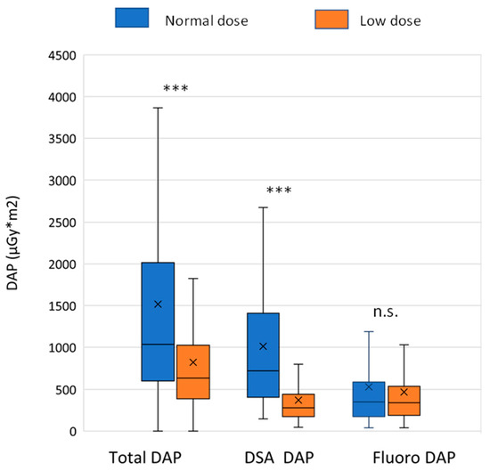 Radiation dose data. Dose-area product (DAP) values were extracted from the dose reports. The box and whisker plots show the median (line), interquartile range (box) and internal fences (whiskers), x denotes the mean value. The Mann-Whitney test was used for statistical analysis (*** p < 0.001). DSA: digital subtraction angiography.