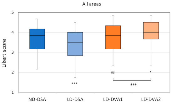 Visual evaluation data, overall results. Images were evaluated in a blind, randomized manner by six readers using a 5-grade Likert scale. All LD images were generated from the same unsubtracted series. The box and whisker plots show the median (line), interquartile range (box) and internal fences (whiskers). The Kruskal-Wallis test followed by Dunn test (* p < 0.05, *** p < 0.001) was used to compare LD groups to the ND group, whereas the Wilcoxon signed rank test (+++ p < 0.001) was used to compare the DVA image types. DSA: digital subtraction angiography; DVA: digital variance angiography.