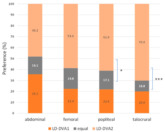 In comparison of DVA1 and DVA2 algorithms, the Wilcoxon signed rank test was used for statistical analysis, as the images pairs were generated from the same unsubtracted series. Overall, LD-DVA2 images received significantly higher scores than LD-DVA1 images (4.00 (0.83) vs. 3.83 (1.17), p < 0.001). Concerning the anatomical regions, no significant difference was seen between LD-DVA1 and LD-DVA2 in the aortoiliac region (4.33 (0.54) vs. 4.33 (0.5), p = 0.55), but LD-DVA2 received significantly higher scores in the femoral (4.17 (0.79) vs. 4.33 (0.5), p < 0.001), popliteal (3.67 (0.87) vs. 4.00 (0.79), p < 0.001) and talocrural (3.17 (1.00) vs. (3.67 (1.00), p < 0.001) regions compared to LD-DVA1 images (Figure S1). This gradually increasing difference was even more obvious when the average visual scores were compared (Figure 4). The average score of LD-DVA2 images was higher in 48%, 59%, 61% and 70% of image pairs in the aortoiliac, femoral, popliteal, and talocrural regions, respectively. In the latter two cases, the difference was already significant by using the two-tailed Z test (p < 0.05 in the popliteal and p < 0.001 in the talocrural region). A representative image set illustrates the difference between LD-DSA, LD-DVA1 and LD-DVA2 (Figure 5).