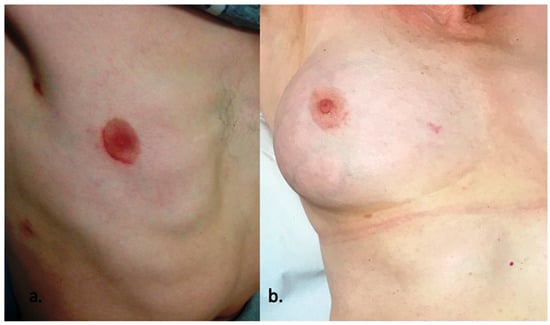 The mini-sternotomy approach to CHD has been studied, with an associated reduction in post-operative drainage, shorter hospital length of stay and improved cosmesis compared to standard median sternotomy []. Right anterolateral mini-thoracotomy has been widely applied as an alternative to median sternotomy, with similar mortality and post-operative morbidity and superior cosmetic results compared to sternotomy. Minimally invasive video-assisted and endoscopic surgical closure have previously been described with detailed outlines of the approach and surgical technique [,]. Single-centre reports describing the evolution of practice and decades-long experience with minimal-access approaches to ASD closure in the adult have been reported [,,,,], including comparisons of median sternotomy, totally thoracoscopic and axillary thoracotomy access techniques []. A recent systematic review and meta-analysis by Lei et al. [], including 7 publications and 665 patients, compared short-term outcomes between anterolateral mini-thoracotomy and median sternotomy for the surgical treatment of ASD. They concluded that both approaches were equally safe and effective, with similar success and complication rates. Anterolateral mini-thoracotomy was associated with a faster return to function and better cosmetic results compared to the sternotomy group. The cosmetic benefit is amplified with the use of the periareolar incision, which is adopted within our unit, and it is shown in Figure 1.