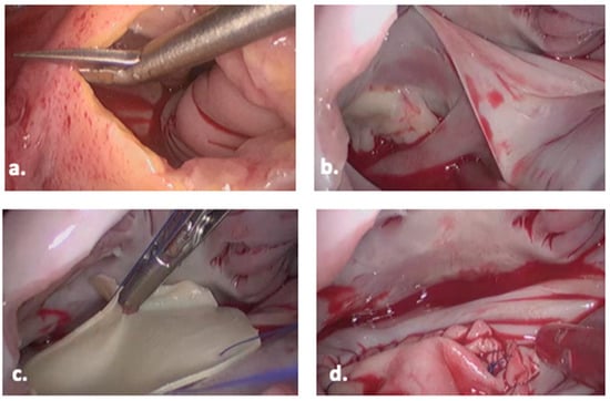 Operative view of pericardial patch closure of secundum ASD: (a) the right atrium is opened, (b) the boundaries of the ASD are identified, and (c) sutures are placed in the rim of the ASD and bovine pericardium is parachuted into the right atrium. The ASD repair is continued using a running suture and (d) the patch repair is complete.