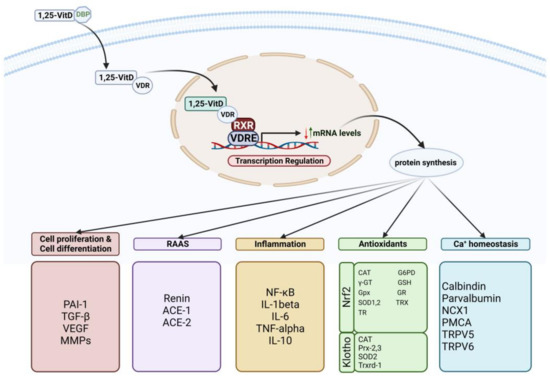The role of vitamin D and vitamin D receptor (VDR) in the regulation of a vast number of genes located in several cell types to express proteins that act in a variety of cellular functions. Created with BioRender.com.