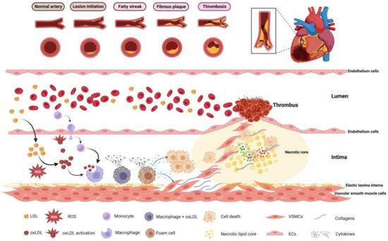 Explanation of the mechanism that contributes to the formation of atherosclerotic plaques. Abbreviations: LDL: Low-density lipoprotein; oxLDL: Oxidized LDL; ROS: Reactive oxygen species; VSMCs: Vascular smooth muscle cells; ECs: Endothelial cells. Created with BioRender.com.