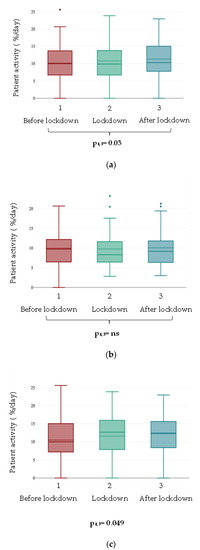 | Patient activity (%/day) | 10.2 ± 5.5 | 8.95; 11.35 | 10.8 ± 5.4 | 9.62; 11.98 | 11.3 ± 5.3 | 10.16; 12.46 | 0.013 |