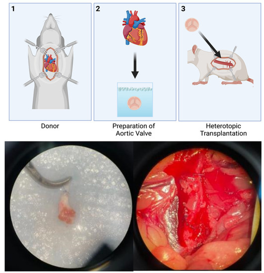 Abdominal Aortic Model for Heterotopic Partial Heart Transplantation, Created with BioRender.com. (1) Donor valve is harvested (2) the aortic valve is prepared for transplantation (3) the valve is transplanted into the abdominal aortic position in the recipient rat. Intraoperative photographs show the donor aortic valve before and after heterotopic transplantation.