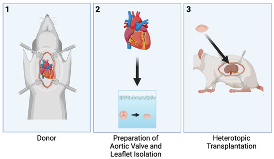 Renal Subcapsular Model for Heterotopic Partial Heart Transplantation, Created with BioRender.com. (1) Donor valve is harvested (2) the aortic valve is divided into leaflets and prepped for transplantation (3) the valve leaflet is transplanted into the renal subcapsular position.