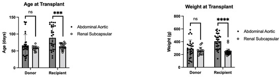 The average age (days) and average weight (grams) of both donor and recipient rodents are compared between the renal subcapsular model and the abdominal aortic model for heterotopic partial heart transplantation. ns = nonsignificant; ***/**** = statistically significant (p < 0.05).