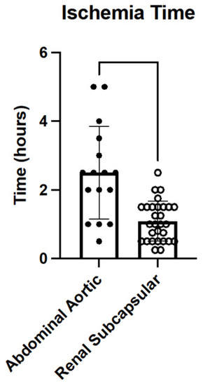 The comparison of graft ischemic times is shown in Figure 4. The difference in ischemic times was found to be statistically significant, with the abdominal aortic model having an increased ischemic time (p < 0.01). The ischemic time was unable to be calculated for all transplants due to limits in documentation. Consideration should be taken to address this in future experiments.