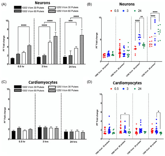 Temporal dynamics of cell death in neurons and cardiomyocytes. The permeability of cells to PI was measured at 1000 V/cm 30 pulses, 1000 V/cm 60 pulses, 1250 V/cm 30 pulses, and 1250 V/cm 60 pulses in neurons (A) and cardiomyocytes (C). The evolution of PI permeable cells was detected at 0.5 (in red), 3 (in blue) and 24 (in green) hours for neurons (B) and cardiomyocytes (D). All data shown as mean ± SEM. Statistical significance was performed using two-way ANOVA (* p < 0.05, ** p < 0.005, *** p < 0.001, **** p < 0.0001). Reprinted with permission from [60] through the Creative Commons attribution license.