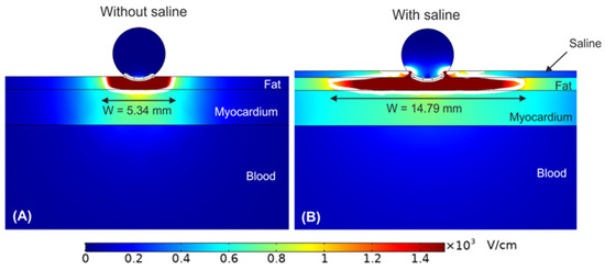 Electric field distribution around the target epicardial site, without (A) and with (B) a saline layer. The electrode is embedded 0.25 mm in the fat layer. The white contour corresponds to the 1000 V/cm electric field isoline. Reprinted with permission from [66] through the Creative Commons Attribution License.