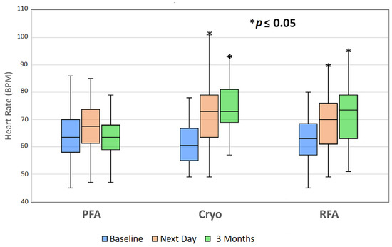 Patient heart rates collected at baseline, day 1 postablation, and 3 months postablation. The asterisk (*) indicates statistical significance (p ≤ 0.05, paired t-test) compared to baseline heart rates. Total of 40 patients in each group. Bars indicate median heart rate. BPM = beats/min; Cryo = cryoballoon ablation; PFA = pulsed field ablation; RFA = radiofrequency ablation. Reprinted with permission from [78]; Copyright © 2022 Elsevier.