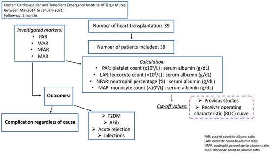 For the patients included in the study, complete blood analysis before and after the transplantation, postoperative glucose level monitoring, periodic 12-lead electrocardiogram, right ventricle biopsies, and infection screening were obtained. The glucose values were determined by fasting glucose blood tests, and infection screening included samples from blood, urine and sputum in order to perform cultures. As part of our research, we analyzed the levels of PAR, LAR, NPAR, and MAR prior to and after the heart transplant, with a focus on the associations of preoperative biomarkers’ values with the incidence of complications in the first two months after the intervention. For the uniformity of the cut-off markers’ values, albumin concentration was evaluated as g/dL, and platelets as the blood count amplified by 109/L. PAR was calculated as platelet count (×109/L) divided by albumin serum concentrations (g/dL), LAR as leucocyte count (×109/L) divided by albumin serum concentrations (g/dL), NPAR as neutrophil percentage divided by albumin serum concentrations (g/dL), and MAR as monocyte count (×109/L) divided by albumin serum concentrations (g/dL) (Figure 1).