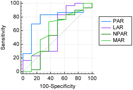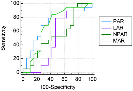Area under the receiver operating characteristic (AUC ROC) curves of our 4 investigated markers (PAR, LAR, NPAR, and MAR) in predicting complications of any cause.