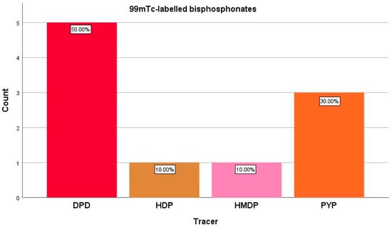 Radiotracers distribution among the included studies. Abbreviations: DPD: 3,3-diphosphono-1,2-propanodicarboxylic acid; HDP: hydroxy-methylene diphosphonate; HDMP: hydroxy-dimethylene diphosphonate; PYP: pyrophosphate.