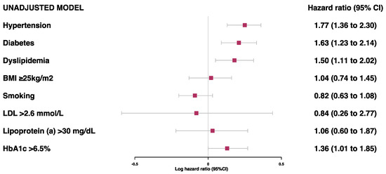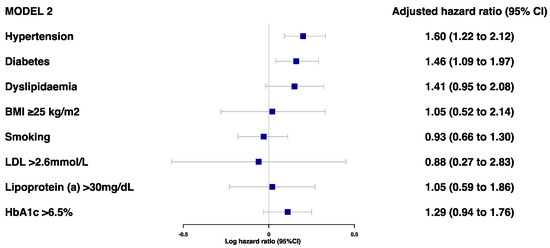 Prior to the adjustments, hypertension, diabetes, dyslipidemia, and HbA1c > 6.5% were found to be associated with a risk of secondary MACE (Figure 1). However, after adjustments for age, sex, and ethnicity, only hypertension (HR 1.60 [95%CI 1.22–2.12]) and diabetes (HR 1.46 [95%CI 1.09–1.97]) were associated with a high risk of MACE (Figure 2 and Table S4). There was no evidence of an association between the risk of secondary MACE with an overweight/obese BMI and current smoking status.