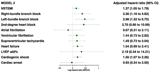 Adjusted model 2 for associations between cardiac characteristics during MI event and risk of MACE (model 2 was adjusted for age, sex, and ethnicity).