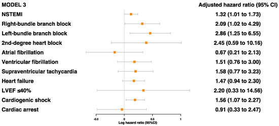 General patterns of association across all levels of adjustment were seen for several factors, which may warrant further investigation. For example, the presence of second-degree heart block, heart failure, and LVEF ≤ 40% showed HRs of 2.09 (95%CI 0.48–9.14), 1.18 (95%CI 0.69–2.01), and 2.24 (95%CI 0.27–18.39), respectively, after adjustments for age, sex, ethnicity, comorbidities, blood parameters, and other cardiac characteristics (Table S4).