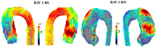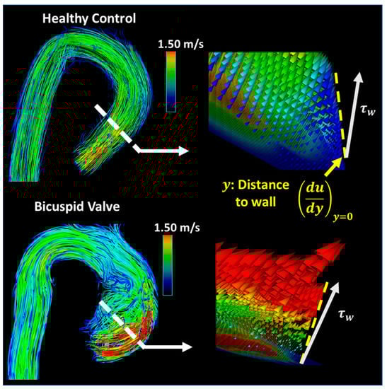 - Meierhofer, C.; Schneider, E.P.; Lyko, C.; Hutter, A.; Martinoff, S.; Markl, M.; Hager, A.; Hess, J.; Stern, H.; Fratz, S. Wall shear stress and flow patterns in the ascending aorta in patients with bicuspid aortic valves differ significantly from tricuspid aortic valves: A prospective study. Eur. Heart J. Cardiovasc. Imaging 2013, 14, 797–804. [Google Scholar] [CrossRef] [PubMed]