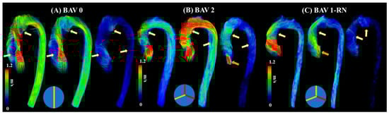 - Rose, M.J.; Rigsby, C.K.; Berhane, H.; Bollache, E.; Jarvis, K.; Barker, A.J.; Schnell, S.; Allen, B.D.; Robinson, J.D.; Markl, M. 4-D flow MRI aortic 3-D hemodynamics and wall shear stress remain stable over short-term follow-up in pediatric and young adult patients with bicuspid aortic valve. Pediatr. Radiol. 2019, 49, 57–67. [Google Scholar] [CrossRef] [PubMed]