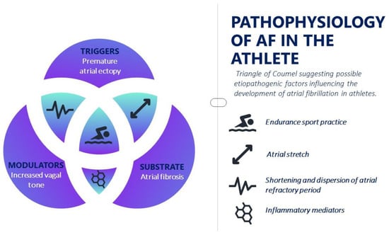 Inflammation plays an important role in promoting and maintaining atrial fibrillation, involving both structural and electrophysiological alterations that lead to atrial remodeling. In endurance athletes, it is well known that strenuous and continuous exercise may promote a generalized pro-inflammatory status, depending on the quantity and quality of exercise not followed by appropriate rest. The inflammatory state is mediated by cytokines such as IL-6, IL-8, and TNF-α; after a mechanical or biochemical myocardial insult, those pro-inflammatory cytokines promote the recruitment of immune cells that infiltrate the atrial myocardium. Monocytes, Th2, and mastocytes, in the late stage of inflammation, promote tissue fibrosis by secreting profibrotic factors such as TGFβ and enhance the activation and differentiation of fibroblasts in myofibroblasts []. In addition, profibrotic factors induce augmented ROS (reactive oxygen species) production through mitochondria, ending in the activation of p38 and ERK1/2 pathways, enhancing the transcription of fibrotic genes. ROS are normally produced by mitochondria through oxygen metabolism, but an excessive increase may directly affect ion channels and the propagation of action potential [].