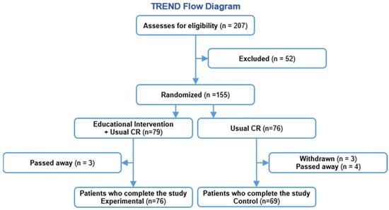 Between 1 April 2019 and 31 March 2020, a total of 207 patients were referred for CR and screened for eligibility (Figure 1). Of these, 22 patients did not meet the inclusion criteria, 30 withdrew, and 79 were randomized to the intervention group and 76 (49%) to the control group.