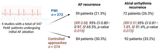 Although several cohort studies and small randomized trials have previously supported the inclusion of posterior wall isolation (PWI) and PVI in patients with persistent AF, data based on large-scale randomized trials are limited [,,,,,]. Kanitsoraphan et al. published a meta-analysis involving eight RCTs and 1024 patients and found that PWI did not significantly decrease overall atrial arrhythmia recurrences (RR 0.96, 95% CI 0.88–1.05, I2 = 31.6%, p-value 0.393): although PWI decreased AF recurrence compared to controlled approaches based on a pooled analysis (RR 0.88, 95% CI: 0.81–0.96, I2 = 48.2%, p-value 0.004), this benefit appears to be offset by increased incidence of atrial flutter after PWI []. In this meta-analysis, a decrease in AF recurrence was noted in the studies that included only persistent AF based on subgroup analysis (RR = 0.89, 95% CI: 0.80–0.98, I2 = 65.2%, p-value 0.014) [] (Figure 1). No significant differences were noted in complications between PWI and control approaches, including risk of vascular access (RR 1.02, 95% CI 0.99–1.04, I2 0.0%, p-value 0.222), pericardial effusion (RR 0.98, 95% CI 0.96–1.01, I2 0.0%, p-value 0.147), pericarditis (RR 1.02, 95% CI 0.99–1.04, I2 1.8%, p-value 0.240), and stroke or TIA (RR 1.00, 95% CI 0.97–1.03, I2 0.0%, p-value 0.950) []. A 2022 stratified pooled analysis including 26 studies with 3287 patients with AF found that adjunctive PWI significantly lowered the recurrence of all atrial arrhythmias (risk ratio: 0.74; p < 0.001) and AF (risk ratio: 0.67; p ¼ 0.01) in PeAF, with patients with older age, large left atrial diameter and PeAF benefiting most from adjunctive PWI [].