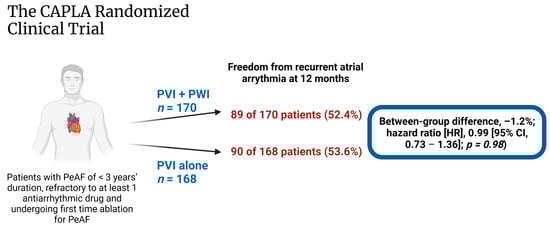 CAPLA, a recent randomized controlled trial involving 338 patients, compared PVI with PWI vs. PVI alone in patients with persistent AF of less than three years duration in whom one or more antiarrhythmic drugs had failed [] (Figure 2). The primary endpoint, which consisted of freedom from any documented atrial arrhythmia of more than 30 s without antiarrhythmic medication at 12 months, was achieved in 89 patients (52.4%) assigned to PVI with PWI compared with 90 (53.6%) assigned to PVI alone (between-group difference, –1.2%; hazard ratio [HR], 0.99 [95% CI, 0.73–1.36]; p = 0.98). In essence, the empirical addition of PWI to PVI alone did not significantly improve freedom from atrial arrhythmia at 12 months in patients undergoing first-time catheter ablation for persistent AF.