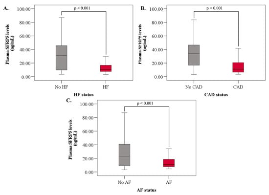 SFRP5 levels were significantly lower in patients with HF (10.7 [3.2, 35.7] vs. 31.0 [3.4, 87.1], p < 0.001), CAD (11.0 [3.4, 87.1] vs. 33.8 [3.2, 83.8], p < 0.001), and AF (11.2 [4.6, 82.0] vs. 23.2 [3.2, 87.1], p = 0.001) (Table 2; Figure 1A–C). There was no difference in SFRP5 levels between males and females. Additionally, patients with diabetes or hypertension did not have significantly different SFRP5 levels vs. those who did not have diabetes or hypertension, respectively. Patients with dyslipidemia had significantly higher (28.5 [3.2, 87.1] vs. 11.1 [3.4, 83.8], p < 0.001) SFRP5 levels, whilst statin use was associated with lower SFPR5 levels (14.5 [3.2, 87.1] vs. 27.7 [3.4, 83.8], p < 0.001). The use of angiotensin-converting enzyme inhibitors/angiotensin receptor blockers (ACEI/ARBs) was associated with a non-significant trend towards lower plasma SFRP5 levels (16.6 [3.9, 83.8] vs. 22.2 [3.2, 87.1], p = 0.08) (Table 2).