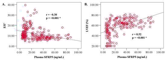 Relationships between SFRP5 and parameters of cardiac (A) diastolic [E/E’] and (B) systolic [LVEF] function. The dots represent individual patient parameters, and the solid line is a line of best fit. p < 0.05 is considered significant (*). LVEF; left ventricular ejection fraction.