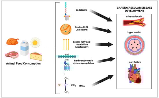 Cardiovascular disease (CVD) is the leading cause of death in the United States, and diet plays an instrumental role in CVD development. Plant-based diets have been strongly tied to a reduction in CVD incidence. In contrast, animal food consumption may increase CVD risk. While increased serum low-density lipoprotein (LDL) cholesterol concentrations are an established risk factor which may partially explain the positive association with animal foods and CVD, numerous other biochemical factors are also at play. Thus, the aim of this review is to summarize the major cellular and molecular effects of animal food consumption in relation to CVD development. Animal-food-centered diets may (1) increase cardiovascular toll-like receptor (TLR) signaling, due to increased serum endotoxins and oxidized LDL cholesterol, (2) increase cardiovascular lipotoxicity, (3) increase renin-angiotensin system components and subsequent angiotensin II type-1 receptor (AT1R) signaling and (4) increase serum trimethylamine-N-oxide concentrations. These nutritionally mediated factors independently increase cardiovascular oxidative stress and inflammation and are all independently tied to CVD development. Public policy efforts should continue to advocate for the consumption of a mostly plant-based diet, with the minimization of animal-based foods.
