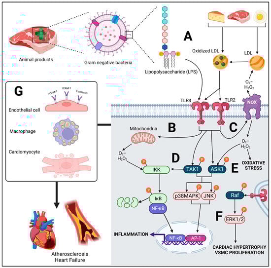 Molecular mechanisms by which TLR ligands derived from the consumption of animal-based foods can promote cardiovascular disease. (A) Lipopolysaccharides (LPS) and oxidized low-density lipoprotein (LDL) derived from animal-based foods can act as TLR ligands. Reactive oxygen species (ROS) derived from (B) mitochondria and (C) NADPH-oxidases (NOX) due to downstream TLR-mediated signaling can oxidize LDL directly or indirectly with secondary oxidative products, such as peroxynitrite (ONOO-). (D) TLR signaling can lead to the downstream phosphorylation of transforming growth factor-β-activated kinase (TAK)1, a mitogen-activated protein kinase kinase kinase (MAPKKK), which phosphorylates IκB kinase (IKK). Alternatively, ROS can induce autophosphorylation of IKK due to reactive cysteine residues. IKK signaling induces phosphorylation of IκB, which then phosphorylates nuclear factor-κB (NF-κB), a nuclear transcription factor that translocates to the nucleus and undergoes DNA binding to induce pro-inflammatory gene expression. (E) The MAPKKK, apoptosis signal-regulating kinase 1 (ASK1) is also activated by TLRs or ROS to phosphorylate p38MAPK and c-Jun N-terminal kinase (JNK), with TAK1 having similar effects. Phosphorylation of these terminal MAPKs results in the nuclear translocation of the activator protein 1 (AP-1) transcription factor family to also induce pro-inflammatory gene expression. (F) The MAPKKK, Raf, is activated by TLR4 and its activation leads to the phosphorylation of ERK1/2 involved in mediating cardiac hypertrophy and the proliferation of vascular smooth muscle cells (VSMCs). (G) These molecular effects at the cellular level drive the development of CVDs, such as atherosclerosis and heart failure. These include endothelial dysfunction and the expression of leukocyte adhesion molecules, the activation of macrophages and foam cell formation in the subendothelial space, as well as cardiomyocyte hypertrophy and eventually apoptosis, as CVD progresses.