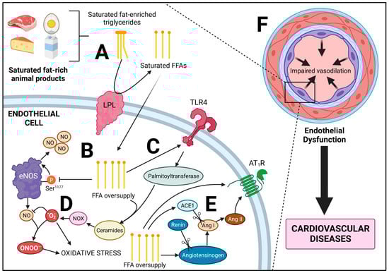 Endothelial lipotoxicity mediated by consumption of saturated-fat-rich animal foods. (A) Excessive consumption of saturated fats from animal foods leads to synthesis of triglycerides which are enriched with saturated fatty acids. Lipoprotein lipase (LPL) in endothelial cells liberates fatty acids from triglycerides, resulting in free fatty acid (FFA)-uptake by the cell. (B) Excessive FFAs in the cell results in FFA oversupply and resulting lipotoxicity. This can result in reduced phosphorylation of endothelial nitric oxide synthase (eNOS) at Ser1177, due to modulation of upstream regulators of Akt. (C) FFA oversupply can exacerbate primed TLR4-mediated inflammatory- and oxidative-stress signaling. TLR4 activation increases the activity of serine palmitoyltransferase, leading to increased ceramide synthesis. (D) Increased intracellular ceramide accumulation can result in increased NADPH-oxidase (NOX) activity, resulting in increased superoxide (O2−) production and a reduction in NO bioavailability, due to peroxynitrite formation (ONOO−). These reactive oxygen and reactive nitrogen species increase cellular oxidative stress. (E) FFA oversupply increases the renin angiotensin system (RAS) via increased angiotensinogen, angiotensin-converting enzyme (ACE)1 and angiotensin II type-1 receptor (AT1R) signaling. (F) Cumulatively, the effects of downregulated eNOS, reduced NO, exacerbation of inflammatory stimuli, increased oxidative stress and increased AT1R signaling which exacerbates these effects, results in endothelial dysfunction and impaired vasodilation, a hallmark of cardiovascular disease and indicator of diminished vascular health.