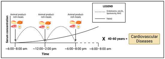 Humans in Western societies usually spend a substantial portion of their waking hours in the postprandial phase (<6 h after a meal), whereas fasting (>6 h after a meal) usually occurs during sleep. Most of the pathological consequences of a poor diet tend to occur in this postprandial phase, in which we would expect an increase in endotoxins [51], oxLDL [149], saturated-fat-rich triglycerides [271] and resulting RAS activation (Figure 4). TMAO would be expected to be delayed postprandially, due to the dependence upon microbial metabolism, and indeed, TMAO blood concentrations peak at 24 h postprandially [248], although Cho et al. [263] found TMAO to be increased postprandially in plasma in as little as 2 h. Nonetheless, chronic consumption of choline- and carnitine-rich animal foods would be expected to result in chronically elevated TMAO whether fasting or postprandial, due to this lag time (Figure 4). With respect to palmitate and total FFAs, while these decline immediately postprandially [272], this is due to cellular uptake as well as some triglyceride formation. However, most triglycerides postprandially are derived from the fat of the meal itself and not endogenous levels [273]. Based on typical Western eating patterns, triglycerides would be expected to be abnormally elevated (>177 mg/dL) for 12–14 h a day [274]. Importantly, lipoprotein lipase concentrations steadily rise postprandially following a high-fat meal, peaking at 6 h [273]. The implication of this is that cells of the cardiovascular system are directly exposed to FFAs released from triglycerides, driving lipotoxicity in this postprandial phase if an animal-rich meal is consumed, particularly one rich in saturated fat. The cumulative effects of these pathological dietary elements in the postprandial/fasting state would suggest that over decades of the human lifespan consuming a diet rich in animal-based foods, the sustained insult to the cells of the cardiovascular system induced by these dietary elements would drive the development of CVD (Figure 4).
