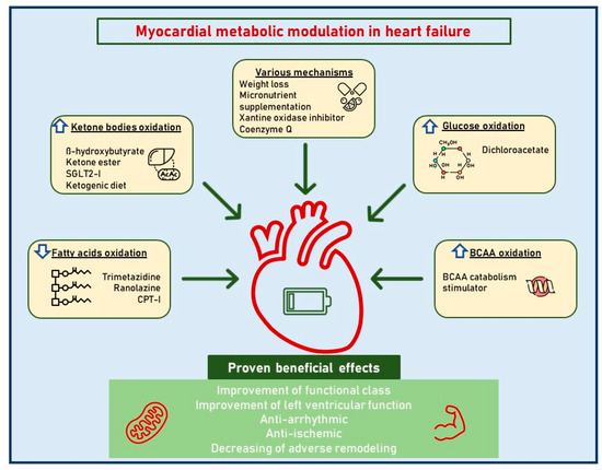 To decrease or even stop HF metabolic derangement, a number of treatment approaches have been suggested, including increasing ketone body oxidation, increasing glucose oxidation and boosting insulin sensitivity, changing fatty acid oxidation, and increasing BCAA oxidation. Many compounds disappointed expectations when tested on HF patients; they displayed inconsistent findings in terms of heart functions or survival outcomes, despite the pre-clinical investigations starting with promising results. It remains to be determined and researched in additional studies whether these unfavorable results are attributable to a poor sample selection (due, for instance, to the severity of HF) or to many and diverse mechanisms that have not yet been fully clarified. The most successful strategy so far appears to include changing how the failing heart uses its substrates while also utilizing a number of pharmacological medications. The majority of the current research findings are consistent with the idea that an effective supplementary treatment for individuals with HF could involve switching the energy substrate preference away from fatty acid metabolism and toward enhanced myocardial glucose consumption. Nevertheless, further extensive multicenter randomized studies are required before the precise role of metabolic treatment in HF can be determined.